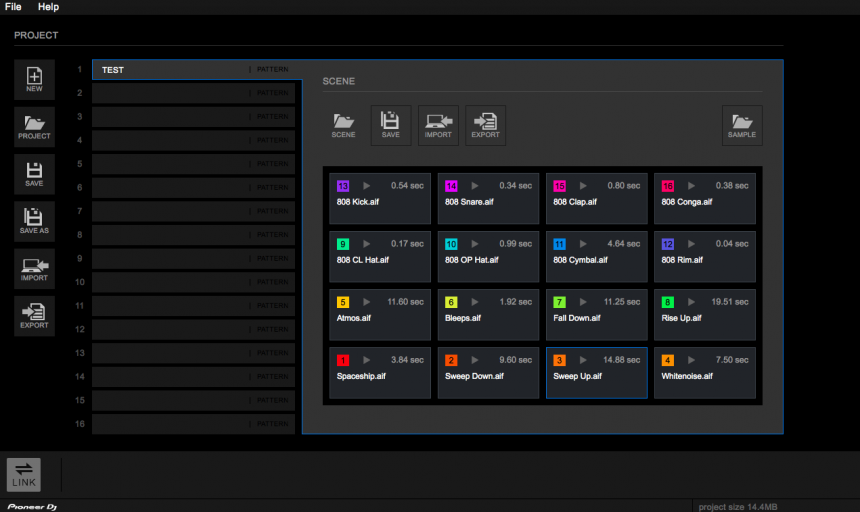 [Índice]Pioneer DJ tiene para descarga libre desde su web un software para crear proyectos y escenas para el DJS-1000 y desde que se actualizó el firmware del Toraiz SP-16 también el software sirve para ese dispositivo. Básicamente el software está pensado para elaborar desde un ordenador pryectos y escenas –conjuntos de muestras asignadas a los pads del dispositivo– para luego exportarlos directamente al DJS-1000. El software no permite desarrollar patrones musicales.