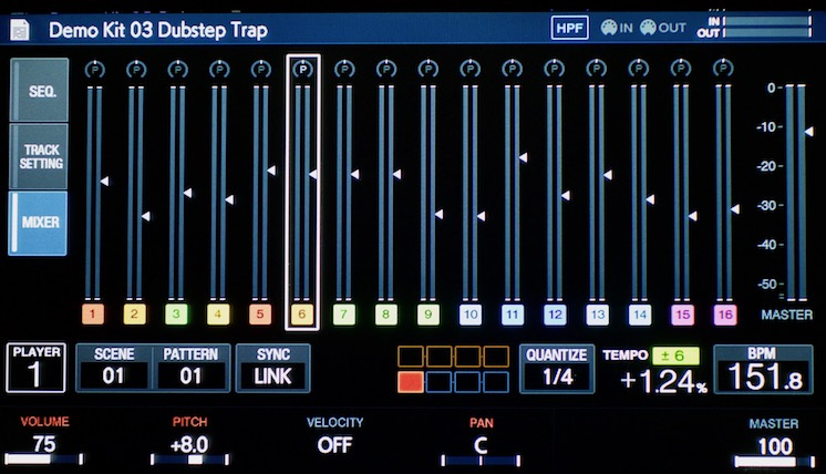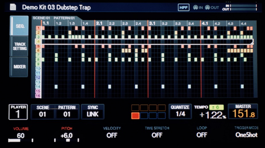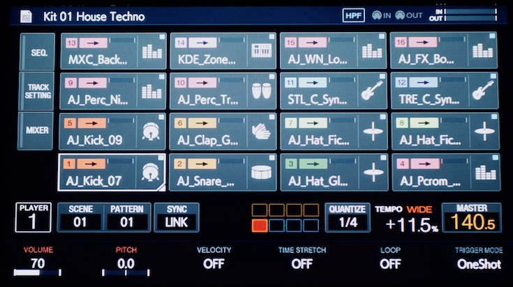 Pegar un vistazo a los proyectos precargados puede ser entretenido, pero es preferible ir directamente a tratar de crear uno nuevo propio para conocer rápidamente la máquina. Así que la acción obvia es moverte con el encoder hasta esa opción y pulsarlo. Al hacerlo se nos presentará en pantalla una matriz con 16 “disparadores”, que corresponden a los 16 pads que hay debajo, y a su vez a los 16 canales del mixer interno del aparato. Esos disparadores pueden contener loops o muestras one-shot que pueden dispararse en cualquier tonalidad gracias al modo Scale del aparato –que además se puede configurar para que la iluminación de los pads nos indique cualquier modo para las escalas–, o bien podemos reservar el trigger para disparar notas MIDI y mensajes CC a un instrumentos externo a través de la salida MIDI del aparato. Hay un modo MIDI especial por si conectas un Toraiz AS-1 de Pioneer DJ pero al no poder disponer de ninguno no me paré a analizar si había diferencias.