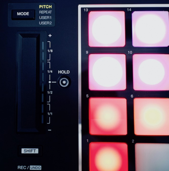 Respecto a cantidades y ubicaciones, en el centro hay 16 pads, debajo 16 pulsadores, sobre todo esto hay 8 encoders infinitos cuya función cambia según lo que estemos haciendo con el aparato y bajo ellos cuatro botones para elegir modos de trabajo. A la izquierda de los encoders infinitos tenemos otro potenciómetro y un botón para activar efectos –al estilo mesa DJM– y bajo él una tira táctil multiuso. En el lado izquierdo de la pantalla tenemos 3 botones más para cambiar de modo el aparato y acceder a diversos menús.