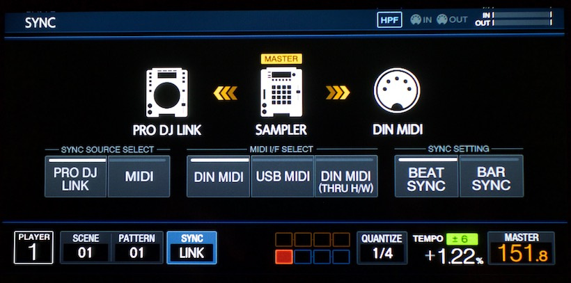 Respecto a la integración con otros equipos DJ, debo decir unas cuantas cosas, y varias de ellas muy positivas. El dispositivo se puede integrar sin problema en una red Pro DJ Link ocupando el mismo lugar que ocuparía un reproductor –aunque no puede cargar proyectos guardados en dispositivos de almacenamiento que estén conectados a otros reproductores de la misma red– y puede tanto sincronizar el tempo de reproducción de los patrones automáticamente con el reproductor master de la red, o directamente ser el DJS-1000 el master de la red.