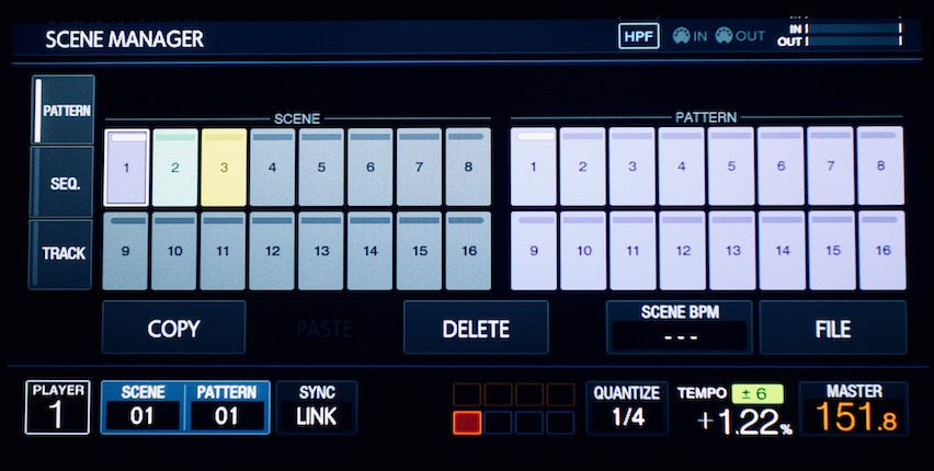 Crear patrones bastante sencillo, pueden ser de hasta 4 compases, y los disparos de loops o percusión se programan fácilmente o bien con el secuenciador por pasos mediante 16 botones en la parte inferior o bien pulsando en grabar y simplemente interpretando desde los pads. La cosa se complica cuando quieres secuencias algo melódico, ya que aunque puedes hacerlo interpretando desde el modo “Scale”, la edición posterior es igual de tediosa que con el SP-16 ya que no pueden ver la tonalidad de cada nota en pantalla si no que se ilumina en cada paso el pad que pulsaste. Para cambiar la nota debes dejar pulsado el botón del secuenciador de abajo al tiempo que pulsas el pad correspondiente arriba.