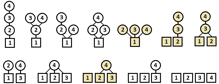 Saliendo del terreno ‘interno’ a cada operador, hay 12 estructuras (algoritmos) que implican posibilidades nuevas respecto a las 8 que aparecían en los DX de 4 operadores. Como no están representados en el manual (sí en la pantalla) os dejo un esquema de los 12, coloreando los 4 que son novedad respecto a los ya presentes el los 4Op de los 80.