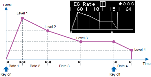 Las envolventes en cada operador se definen, en pura tradición DX, con 4 niveles (level) y 4 velocidades (rate), que ofrecen una versatilidad muy superior a los diseños ADSR convencionales y que permiten crear dibujos de doble decay o doble ataque, entre otros.