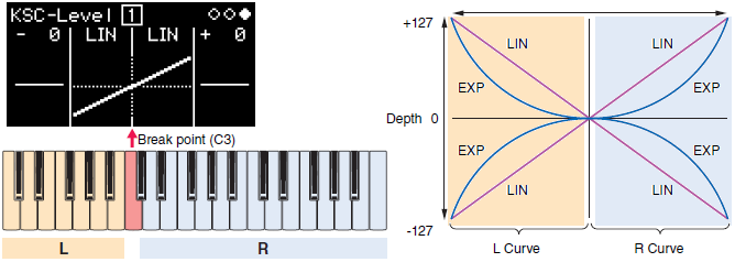 [Índice]Para cada operador encontramos los clásicos controles de frecuencia (con ratio entre 0.5 y 31.99 o valores fijos desde 1 a 9772 Hz) acompañados de ajuste de desafinación. También el imprescindible nivel de salida, que gobierna la amplitud en los operadores portadores y el timbre/brillo en los moduladores. El nivel puede hacerse variable con la velocidad, y con una curva de ‘keyboard scaling’ que recuerda a la del DX-7, con un recorrido lineal o exponencial ajustable a cada lado de un punto de ruptura (que en este caso está prefijado en el do central, no es seleccionable).