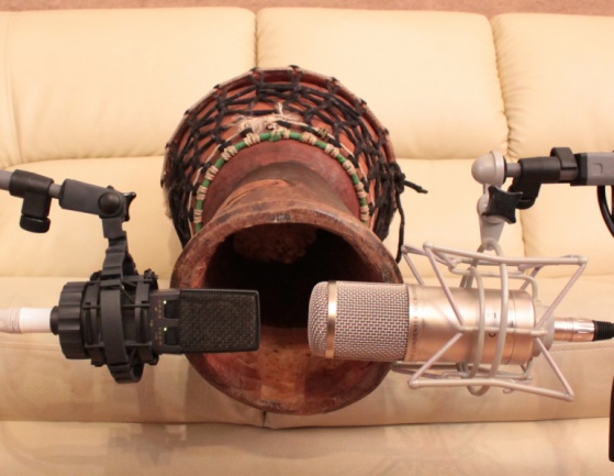 Colocamos un tambor Djembé horizontalmente sobre el sofá de la sala de control y colocamos en su boca el SCT-700 y un AKG C414 XLII, tal y como muestra la figura.