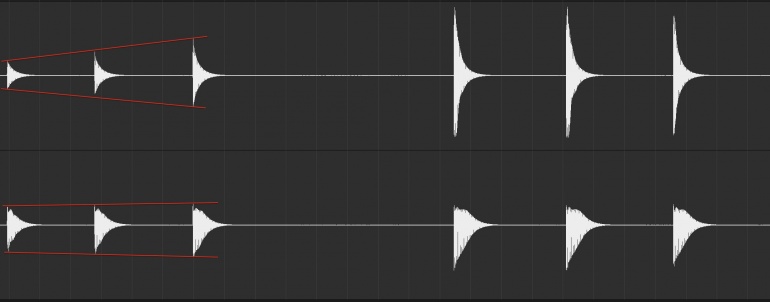 Bien, veamos a donde queríamos llegar con este ensayo. En el siguiente gráfico tenemos arriba las señales registradas por el C414 XLII y abajo, las registradas por el SCT-700. Primeramente golpeamos moderadamente el Djembé en tres ocasiones con intensidad creciente. Como podemos observar, el canal de arriba correspondiente al AKG registra el cambio de volumen marcado por las líneas rojas. Pero en el canal de abajo la respuesta del SCT-700 se ha mantenido constante, debido a que a esos niveles de presión el micrófono ya se encuentra en el codo de saturación.