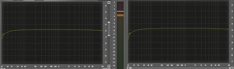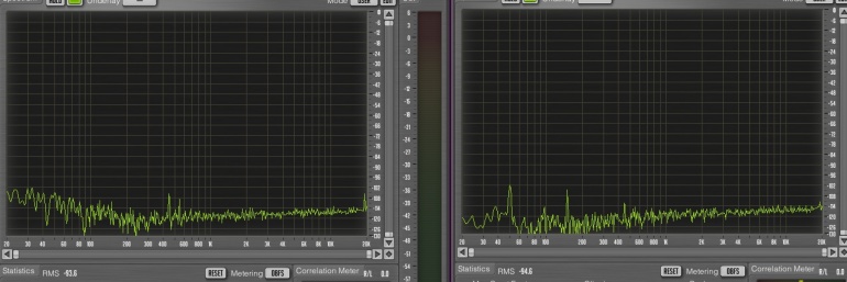 [Índice]Neve anuncia un umbral de ruido de -72,5dBus. Nosotros hemos medido -75,6dBus para L y -76,6dBus para el canal R a ganancia unitaria, lo que supone superar incluso las mediciones oficiales. No es un compresor que destaque en esta variable, pero tampoco queda en mal lugar, colocándose en la zona del Focusrite Red3, el Chandler Zener o el Manley vari mu, pero lejos de los casi -90dBus que pueden alcanzar el SPL Kultube, el Neve Master Buss Processor o el JDK R22, y a otro mundo de los menos de -100dBus de un Fairman TMC.