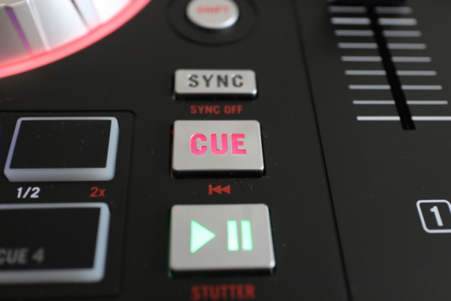 Debajo tenemos uno de los elementos heredados del controlador Numark NV: los jogwheels. Son exactamente los mismos, de cinco pulgadas, con el exterior de plástico y la parte superior metálica. Personalmente en este tamaño no me gustan para scratch, aunque tienen una resolución y sensibilidad fantástica permitiendo ajustes de precisión de manera rápida. Como elemento decorativo, tienen una iluminación roja fija alrededor del jogwheel que no queda nada mal. A un lado del jogwheel tenemos los botones Wheel para elegir el modo del jog –scratch o pitchbend– y el botón de Shift, que usado en combinación con el anterior activa el Keylock. Al otro lado tenemos otro elemento heredado del Numark NV: los controles de pitch. Faders de 100mm firmes y de movimiento suave, con una resolución excepcional en Serato DJ de 0.01 BPM con el rango a +/-8% y +/-16% –en este último hay que moverlo muy suavemente–, una maravilla para un controlador de gama baja. Sobre cada fader de pitch tenemos dos botones para hacer pitchbend. Un poco más abajo tenemos los botones de transporte, Play, Cue, Sync; tienen un aspecto similar al de los del NV, pero el acabado metálico parece menos realista. Al igual que los botones del NV tienen retroiluminación en verde para el Play y rojo para el Cue.
