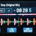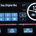 - Tienen 3 modos de visualización, el modo librería, donde navegamos entre todos nuestra música, crates y playlists de iTunes, y dos modos de pista. En los dos modos de pista vemos siempre la representación vista global de la forma, posición de reproducción y hotcues, pero en uno vemos el típico “reloj” de Serato con la representación virtual del disco giratorio, BPM en grande, tiempo, rango de pitch… y en el otro modo de pista no visualizamos el disco giratorio, los datos aparecen distribuidos de otra forma, y tenemos una representación en detalle de la forma de onda. Llos efectos seleccionados (en cada pantalla vemos un banco) y sus niveles, aparecen siempre en la parte inferior en los dos modos de pista.