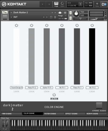 En el caso de Dark Matter 2, podemos cargar el impulso que deseemos a cada uno de los convolvers, eligiendo de otro enorme desplegable que incluye por supuesto reverbs, delays, space echos, pero también cadenas de efectos muy llamativas como "metal box", "water" y una larga serie de cadenas de efectos para guitarra, fuzz o efecto doppler. Una vez cargados los impulsos en los convolvers, la interfaz nos permite regular su intensidad, también automatizados a través de CCs, de modo que podemos pasar nuestros sonidos a través de un space echo y una reverb gigantesca, para después disminuir estos efectos e ir añadiendo un fuzz, una pedalera de guitarra o alguno de los efectos de piano (curiosísimos). La variación que producen los impulsos cargados en los convolucionadores es gigantesca, y además son parte integral del concepto de sonidos en perpetua evolución de la librería. La modulación de las fuentes de sonido y los convolucionadores hace que el sonido vaya mutando poco a poco, tanto o tan poco como queramos, y esto hace que Dark Matter 2 sea obviamente perfecta para las bandas sonoras de videojuegos, underscoring, o simplemente la creación de texturas.