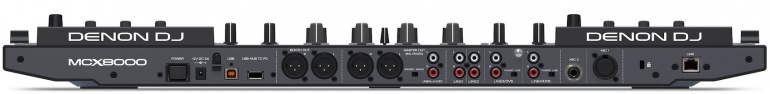 En la parte trasera tenemos la conexión USB tipo B para conectar al ordenador, y una conexión USB tipo A que sirve de “microhub” y nos permite conectar cualquier periférico al ordenador para así reaprovechar la conexión del ordenador que usamos para el MCX8000. Junto a estos conectores está el botón de encendido y la toma de corriente para el transformador externo de 12v. Tenemos también ahí la salida master y de monitores en formato XLR y una segunda salida master en formato RCA. Tenemos una entrada en formato RCA para cada canal, siendo las de los canales 3 y 4 de niveles conmutables entre phono y línea mediante interruptores independientes. También las entradas de micro, una en formato TS y la otra empleando un conector combo XLR/jack.