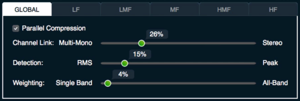 Además encontramos ajustes continuos para definir si deseamos una compresión gobernada por la mezcla de los dos canales estéreo o con una actuación más individual sobre los canales, si deseamos atender a la envolvente RMS/promedio o bien a los picos, y si queremos que cada una de las 5 bandas actúe sólo con su propia referencia o preferimos que la actuación se empape también de los canales adyacentes o incluso llegando al comportamiento ‘full band’ que en la práctica eliminaría el carácter multibanda.