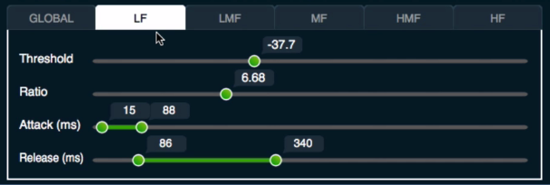 Para cada una de las bandas encontramos los controles clásicos de un compresor reunidos en una pestaña (LF, LMF, MF, HMF, HF): ‘threshold’ y ‘ratio’ más esa capacidad ya citada de definir un rango (mínimo/máximo) para el tiempo de ataque y otro para el tiempo de release. Definido cada rango, DynOne optará por los valores más cortos cuando la señal de control en esa banda tenga factores de cresta altos (que implican rápidas variaciones de dinámica) y por los más largos en caso contrario. Realmente se nota y se agradece este detalle del rango.