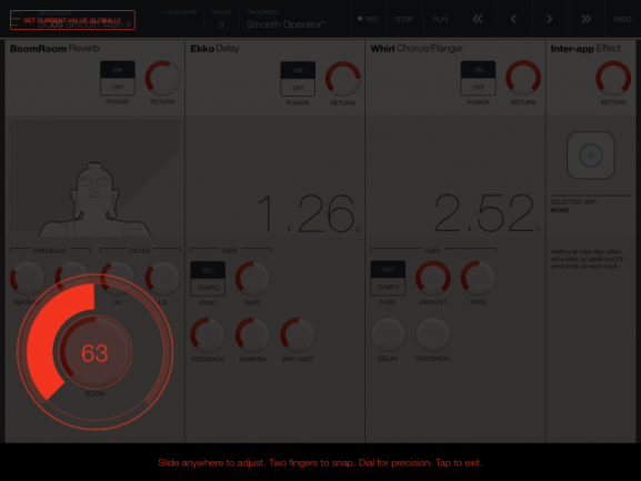 Debajo tenemos una zona de control táctil cuya parte superior sirve para disparar un efecto “Tape Stop” al tocarlo con dos dedos (mas bien parece un vinilo al parar), y la inferior para regular un efecto que combina una especie de loop roll con un filtro bipolar. Un poco más abajo, tenemos el famoso control Note Repeat, fabuloso para crear redobles automáticamente (el trap se nutre de esto últimamente mucho), Time Correct para elegir la cuantización que queremos, Erase para borrar notas al vuelo, Pad Mute y Track Mute para silenciar sonidos concretos o pistas enteras. Note Variation es un control en forma de fader que moviéndolo mientras tocamos los pads nos permite realizar variaciones en aspectos del sonido como la tonalidad, el filtro, la resonancia o la velocidad (que define el volumen al que suena). En lugar de hacer esto moviendo el fader, podemos activar la función 3D Perform y hacerlo inclinando el iPad, aprovechando su acelerómetro, aunque si os digo la verdad, la función no es muy práctica que digamos, el iPad es mejor tenerlo quieto sobre algo.