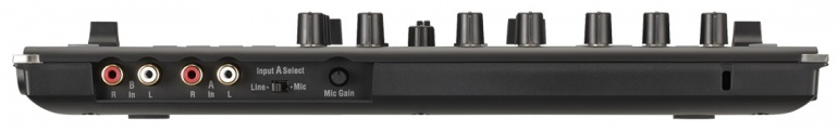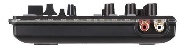 En el lateral derecho tenemos la salida Master en formato RCA. Lo habitual en aparatos de este tamaño. Detrás tenemos dos entradas en formato RCA a nivel de línea, cada entrada es para cada canal del aparato al usarlo en modo mixer autónomo. No podrás conectar platos directamente al carecer de entradas con previo phono, para dicha tarea necesitarías comprar previos independientes aparte. En la parte frontal tenemos la conexión de auriculares de ⅛” y una conexión de micro. El volumen del micro lo tenemos curiosamente detrás, ¿un poco raro, no?