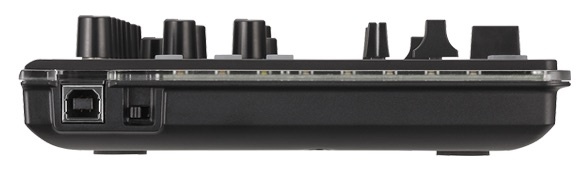 [Índice]En el lateral izquierdo el Kaoss DJ tiene el puerto USB a través del cual se conecta al ordenador y recibe alimentación. Cuando se usa en modo mixer autónomo, esta misma conexión se emplea para alimentar el aparato con un transformador de 5v con puerto USB, y que no viene incluido con el aparato. Junto al puerto hay un pequeño interruptor para seleccionar si queremos usar el Kaoss DJ como controlador o como mixer.