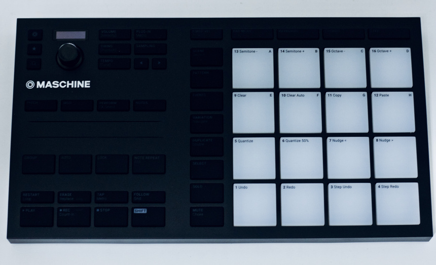 [Índice]Centrándonos en el dispositivo físico, lo que tenemos es un controlador de 16 pads fabricado en plástico y goma. El diseño sigue las mismas líneas que la marca estrenó con la Maschine MK3 y que han trasladado tanto a sus teclados como a los controladores DJ: líneas rectas, color negro, botones negros con la rotulación retroiluminada, nada de serigrafías sobre el cuerpo del aparato. El plástico no es sinónimo de malos acabados, el controlador parece bien construido y a la vez es ligero, se podría transportar en una mochila sin mayor problema, y seguramente has transportado libros mucho más pesados.