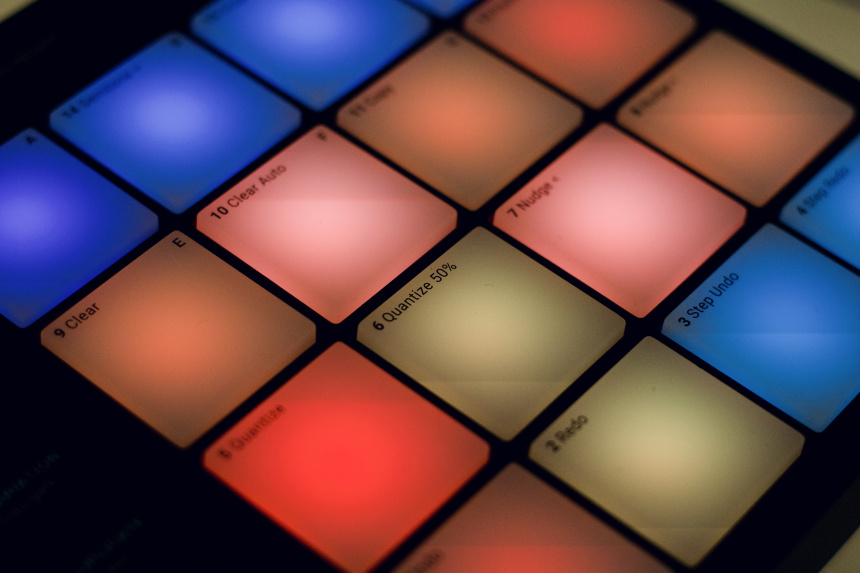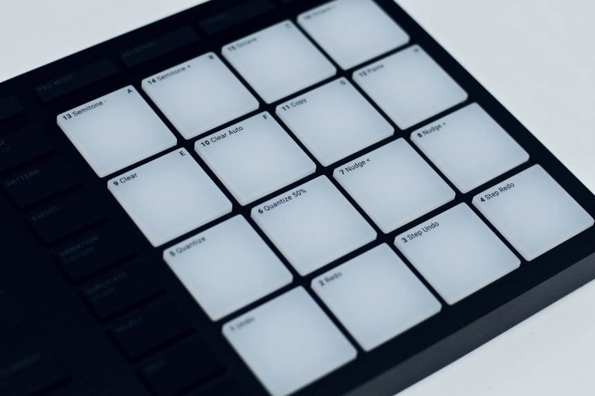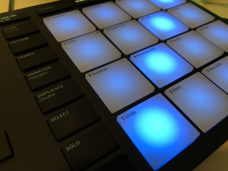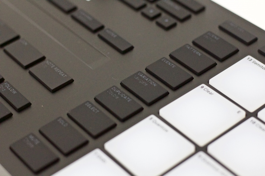 Los pads son de una goma más dura que en anteriores maschines, pero debo destacar que el tacto de los mismos es muy agradable, una goma muy suave, y su sensibilidad es perfecta –puedes ajustarla desde las preferencias del software–. La iluminación RGB de los mismos es adecuada pese a alimentarse únicamente por USB el controlador. Los botones tienen un tacto casi igual de agradable, la pulsación es lo suficientemente dura como para no accionarlos por error sin resultar incómoda, aunque el sonido que hacen al pulsarlos es algo “feo”. De todos modos cuando uses el controlador lo que debería estar escuchando es música.