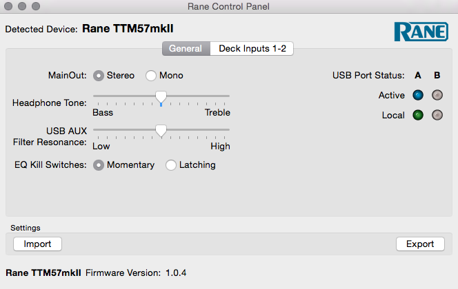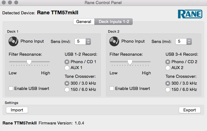 [Índice]El mixer es class compliant y en OSX no necesita la instalación de ningún driver. En Windows se encarga el propio instalador de Serato DJ de instalar un driver ASIO. Lo que sí es necesario instalar –aunque realmente no obligatorio– es un panel de control cuya última versión podemos descargar de la web de Rane.