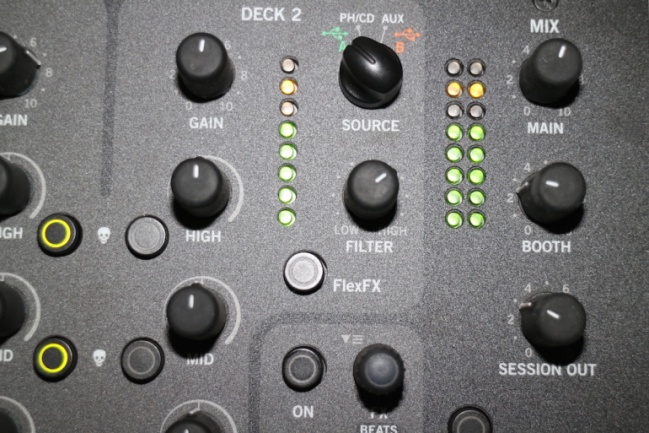 [Índice]En cada canal del TTM57mkII disponemos de los clásicos tres controles de EQ –el crossover se puede cambiar desde el panel de control por software del mixer– y tres botones de kill instantáneo para cada corte, la función de kill puede emplearse de manera temporal manteniendo el botón pulsado o se puede dejar fija pulsando el botón Shift. Los vúmetros de cada canal son de 8 leds, pero tienen un pequeño problema: no tienen serigrafiado ninguna escala de valores.