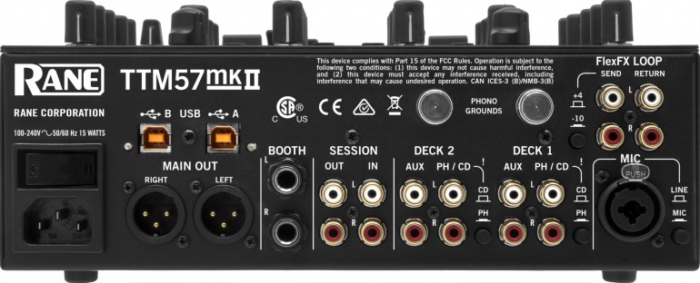 [Índice]En el panel trasero tenemos dos pares de conexiones RCA para las entradas de cada canal, una de las conexiones a nivel de línea y las otras dos a nivel conmutable entre phono y línea mediante un interruptor. Disponemos de tres salidas principales, la salida Master con conexión XLR, la salida Booth con conexiones jack y la salida Session con conexión RCA –cada salida tiene su control de nivel independiente–, contamos también con una entrada Session In, para realizar grabaciones de la sesión en caso de que haya varios DJs trabajando con más de un mixer. Disponemos de conexiones inserción de efectos en formato RCA –sistema FlexFX lo llama Rane– y una conexión de entrada mixta jack/XLR conmutable entre micro y línea con un interruptor. El mixer dispone de doble conexión USB, para poder conectar dos ordenadores y compartir el mixer con otros DJs a la vez y hacer transiciones perfectas durante una sesión; esto es algo que Rane lleva tiempo incorporando y que otros fabricantes como Pioneer han empezado a copiar en sus modelos de gama alta desde hace no mucho.