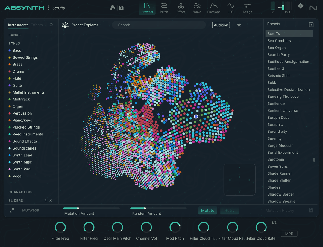 La biblioteca también crece, y tenemos 415 nuevos presets de instrumentos, 30 nuevos preajustes de efectos y 266 nuevas muestras, junto con la posibilidad de cargar presets heredados desde Absynth 4 y 5. Y volviendo al nuevo explorador de sonidos, se trata de un buscador impulsado por inteligencia artificial que organiza los sonidos en un mapa visual 2D según sus características tímbricas, facilitando así una exploración sonora más intuitiva que ayudará a encontrar nuevos timbres en segundos. Un detalle interesante en lo que respecta a sonidos es que Absynth 6 incluye además presets creados por artistas como Brian Eno, Kaitlyn Aurelia Smith y Richard Devine. Y según Native Instruments, en el futuro se irán añadiendo más sonidos de artistas reputados.