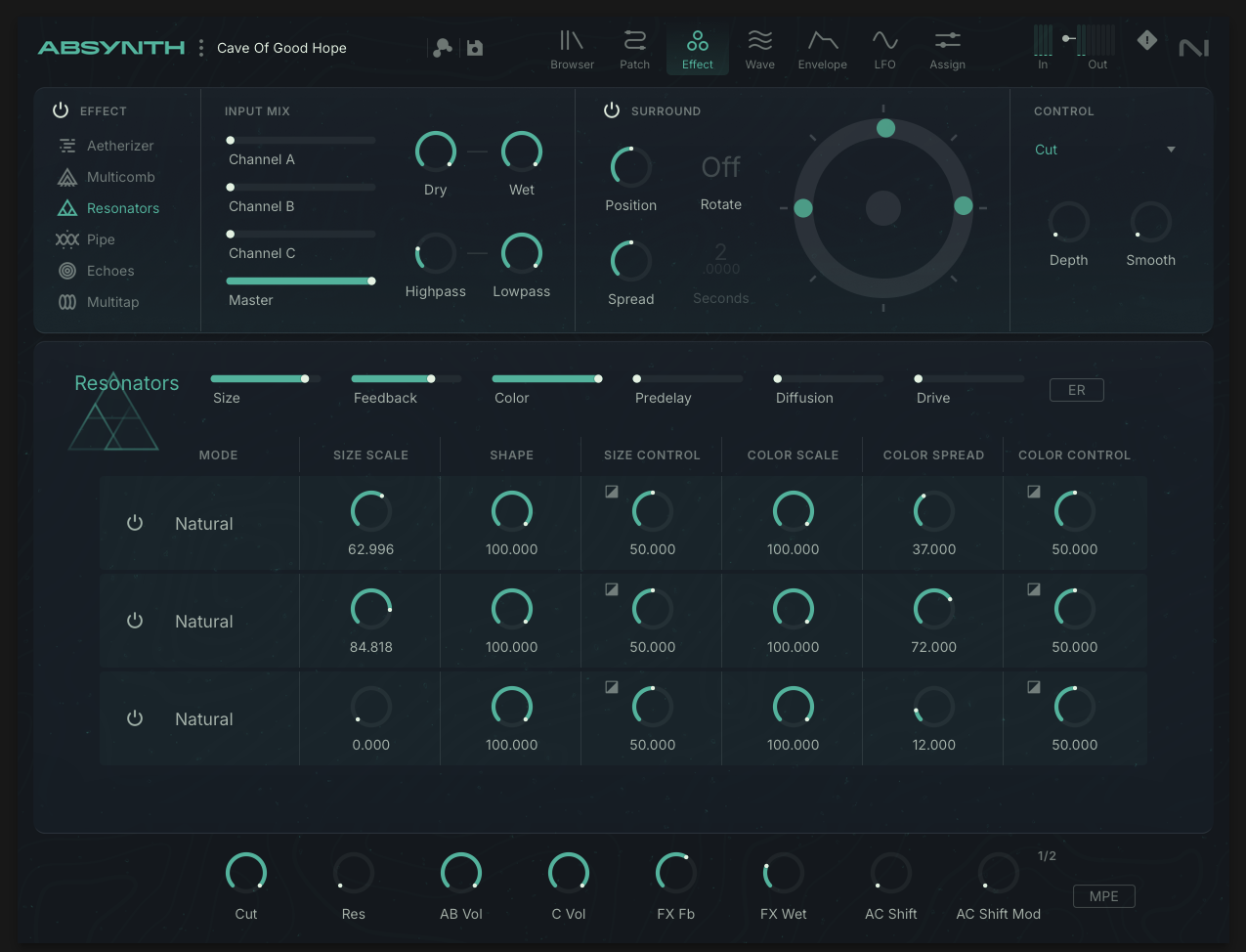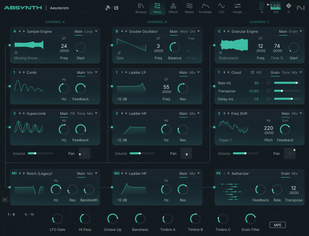 En cuanto a la interpretación, la gran novedad es el soporte para MPE y aftertouch polifónico, que abre nuevas formas de interactuar con el corazón sonoro de Absynth. Esta era una funcionalidad que los usuarios de Absynth estuvieron pidiendo durante años, y que sin duda celebrarán ahora que su sintetizador renace. Como apunte final, en mi teclado Komplete Kontrol MK2 la integración se limita a un par de páginas de controles macro y a la envolvente global. Es una restricción en parte lógica, derivada de la naturaleza semimodular y casi infinita del motor del sintetizador, pero hubiese sido interesante poder acceder a más opciones de edición directamente desde los teclados de Native Instruments.