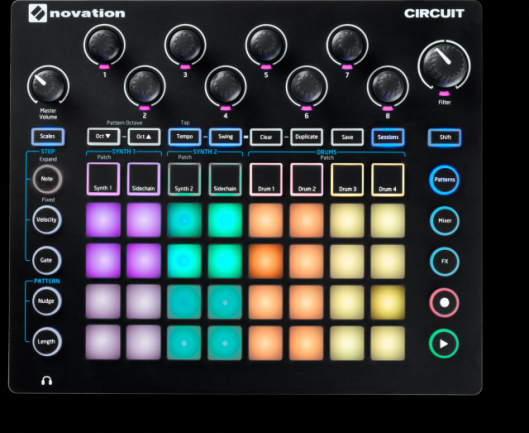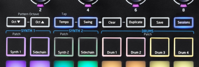 ‘Session’ (hasta 32 guardadas internamente) es por cierto el nombre que recibe en Circuit un juego de 8 patrones de 16 pasos para cada una de las 4 pistas Synth1, Synth2, Drum1/2 y Drum 3/4. Circuit permite combinar los patrones de una sesión al vuelo usando la matriz de 32 pads para escoger cuál de los 8 ha de sonar en cada pista. Una sensación en hardware que recuerda la experiencia de lanzar y combinar patrones, asociada a menudo al uso de ordenador y aplicaciones como Ableton Live. Es también posible conmutar de una 'session' a otra sin necesidad de ‘stop’, superarando así el límite de 8 patrones durante el desarrollo de una canción (p.ej. con sesiones diferentes dedicadas a intro, estrofa, estribillo, puente, etc.).