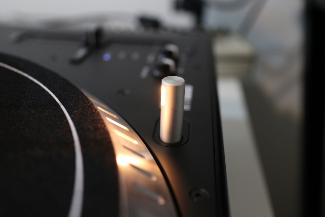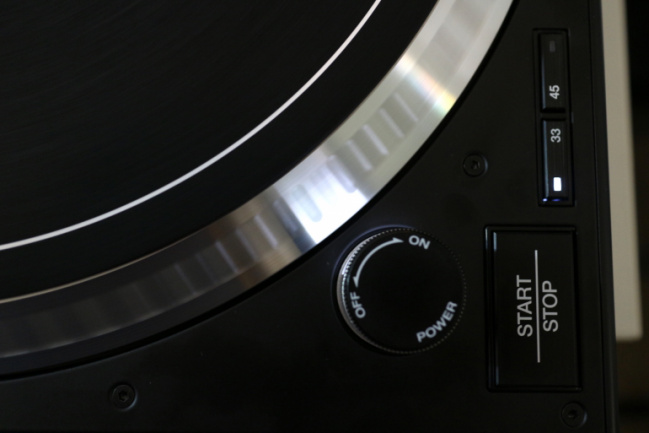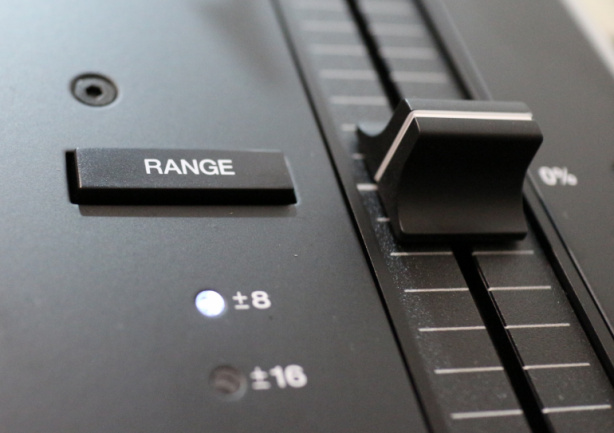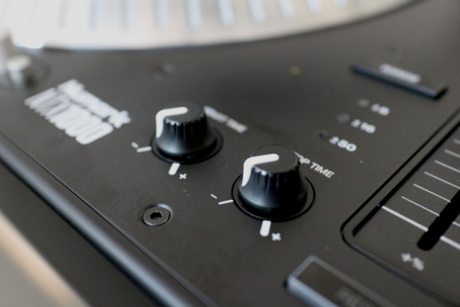 Respecto a los controles y botonería del plato, todos los botones están hechos en plástico negro, el montaje está bien y parecen duraderos, aunque su pulsación es algo ruidosa. El interruptor de encendido es exactamente igual que el de los Technics, aunque su luz estroboscópica es un elegante blanco de LEDs –igual que toda la iluminación del plato–; como punto positivo, el interruptor es notablemente más duro que accionar que los de los clásicos SL-1200MK2, con lo que no existe el peligro de accionarlo de manera accidental al pasar la mano rápido cerca. El control de pitch es bastante suave de accionar y tiene tanto click central como un botón de reset en la parte inferior que bloquea el pitch en 0% sea cual sea su posición. El plato dispone de tres rangos de pitch, 8%, 16% y 50% seleccionables cíclicamente desde el botón “Range”. Todos los botones antes mencionados tiene iluminación en LEDs blancos. Finalmente el plato tiene dos controles para regular el tiempo de arranque y parada del plato. La luz de la aguja es retráctil, con un mecanismo que parece muy sólido, y curiosamente emplea una bombilla en lugar de un LED.