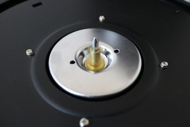 La bandeja del plato es exactamente la misma bandeja de aluminio moldeado que ya se empleaba con la serie TTX, mismo diseño y acabado “antigrip” que Numark asegura que mejora el deslizamiento del slipmat que hay bajo el vinilo. El método que emplea Numark para la fijación de la bandeja al motor y la forma en que se transmite la rotación a la misma es prácticamente la misma que ya se empleaba en los TTX y que difiere bastante de la competencia. Mientras que otros fabricantes emplean una fijación directa al espárrago del motor y una corona bajo la bandeja recibe directamente el empuje magnético del stator, Numark coloca una pieza giratoria sobre el stator –en este modelo de hecho la pieza tapa todo el stator– y la bandeja encaja sobre esta pieza. Hay que estar al tanto de este método a la hora de ensamblar la bandeja porque a diferencia de otros platos en los que podemos encajar la bandeja en cualquier posición, en este tipo de plato hay que alinear los pivotes inferiores de la bandeja con los orificios de la pieza que tapa el stator.