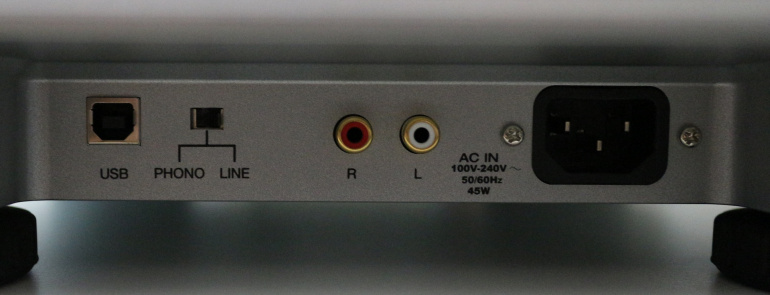 Concretando las conexiones, está la típica conexión para el cable de alimentación IEC, la salida RCA de audio con señal conmutable entre phono y línea –mediante un pequeño interruptor–, y un puerto USB tipo B. El puerto USB al conectarlo a un ordenador es detectado como un dispositivo de audio con dos canales de entrada a 16 bits y 44kHz, y permite digitalizar el sonido de los vinilos; siempre que se use el puerto USB el interruptor de la salida de audio debe estar en la posición de línea. Y no, no está la típica toma de tierra, ya que el plato está conectado a tierra a través del conector IEC, así que un cable menos molestando.