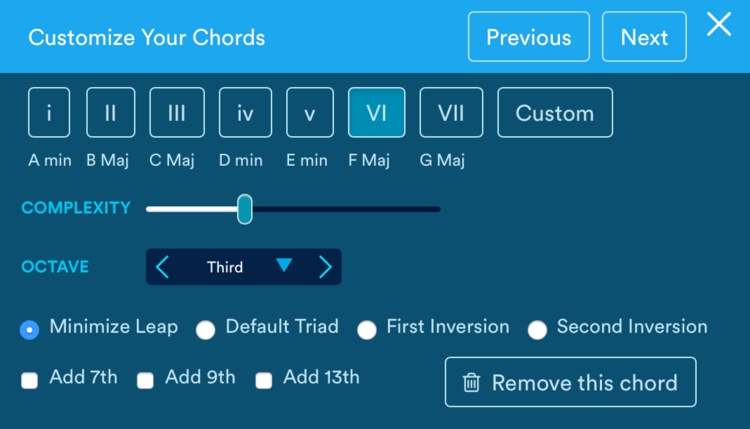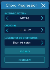 Las progresiones son de 4 acordes (manualmente pueden introducirse más cambios si lo deseamos) y se definen jugando con las indicaciones de grado y no con notas raíz concretas para hacerlas independientes de la tonalidad (tipo I-iii-IV-V). En muchos casos son progresiones con más actividad de la necesaria para el dance, donde 4 acordes en 4 compases puede ser más movimiento del deseado. Por ello he acudido a menudo a las opciones para modificar los acordes, o extender sus duraciones, cuestiones que resultan sumamente sencillas.