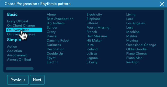 [Índice]En el caso de los acordes el resultado final será la combinación de una progresión de acordes, que puede elegirse entre un amplio catálogo supuestamente extraído del análisis de temas exitosos en Beatport, y un patrón de tipo rítmico también seleccionable entre una amplia oferta y que se aplicará para la ejecución ‘en bloque’ de los acordes a lo largo de los compases que dure la progresión. Encontramos patrones de ejecución simples como lanzar el acorde una vez por compás o una vez por tiempo a otros mucho más ricos en los que abundan usos sincopados, contratiempos, y todo tipo de juegos que llegan a alcanzar una complejidad importante, con desarrollo a lo largo de varios compases.
