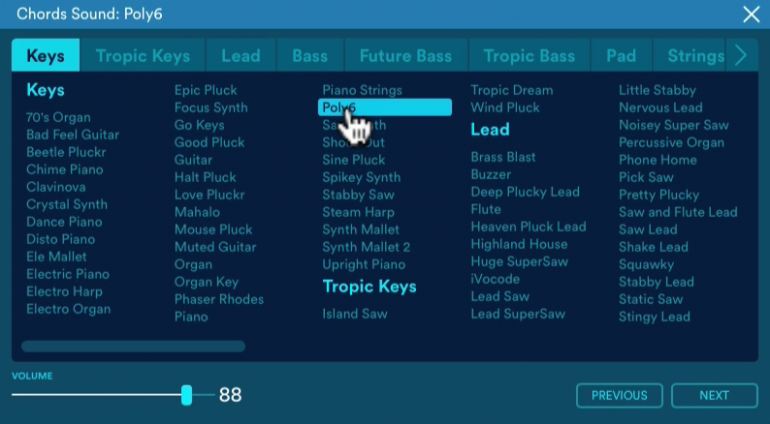 Se cuenta con una paleta amplia de sonidos instrumentales y kits de percusión y sobre los que es posible aplicar algunos efectos básicos (delay, reverb, y filtrado LPF/HPF al gusto EDM), aunque se permite también disparar sonidos de los instrumentos plugin que tengamos en el ordenador.