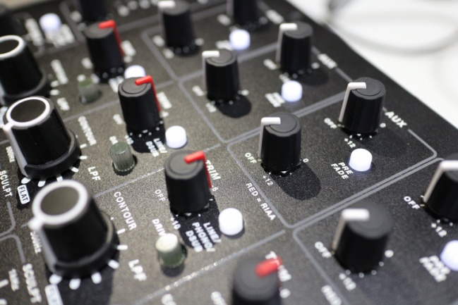 - Los controles de la peculiar EQ: al igual que la Xone:92, tenemos cuatro controles para la EQ, pero lo que hace la EQ de Model 1 no tiene nada que ver. El primer control es un filtro paso bajo y el control inferior es un filtro paso alto; ambos filtros tienen una pendiente de 12db. El paso bajo corta progresivamente todas las frecuencias por encima de 500hz y el paso alto corta progresivamente todo lo que hay por debajo de 1khz. Los dos controles centrales, denominados sculpt, sirven para elegir una frecuencia entre 70hz y 7khz y aplicarle +8db o -20db. Los controles de filtro son más grandes y bastante más suaves al giro –además curiosamente cuando llevas un rato usando la mesa parece que se vuelven aún más suaves–, y permiten acciones muy rápidas, mientras que los controles de sculpt son más delgados y notablemente más firmes al giro.
