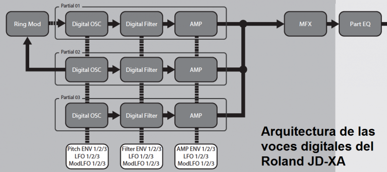 Un sintetizador de tipo rompler/workstation moderno usa varias secciones, aquí llamadas 'partials', para construir cada sonido. Cada uno de los 3 'partials' de un sonido digital del JD-XA es un potente sintetizador en sí mismo, con oscilador/filtro/envs/lfos. Se acumulan así cientos de parámetros en la creación de cualquier sonido. Pero el panel llega a hacer editables los parámetros más habituales de forma directa y pudiendo muy velozmente editar ya sea detalles específicos de un 'partial' o actuar globalmente sobre todos los 'partials' de un sonido.