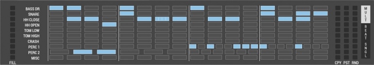 Cada una de las 10 filas de un patrón puede individualmente aleatorizarse para rellenarla, y hay también opciones para copiar/pegar entre filas o rellenar automáticamente una fila con todos los pasos activados.