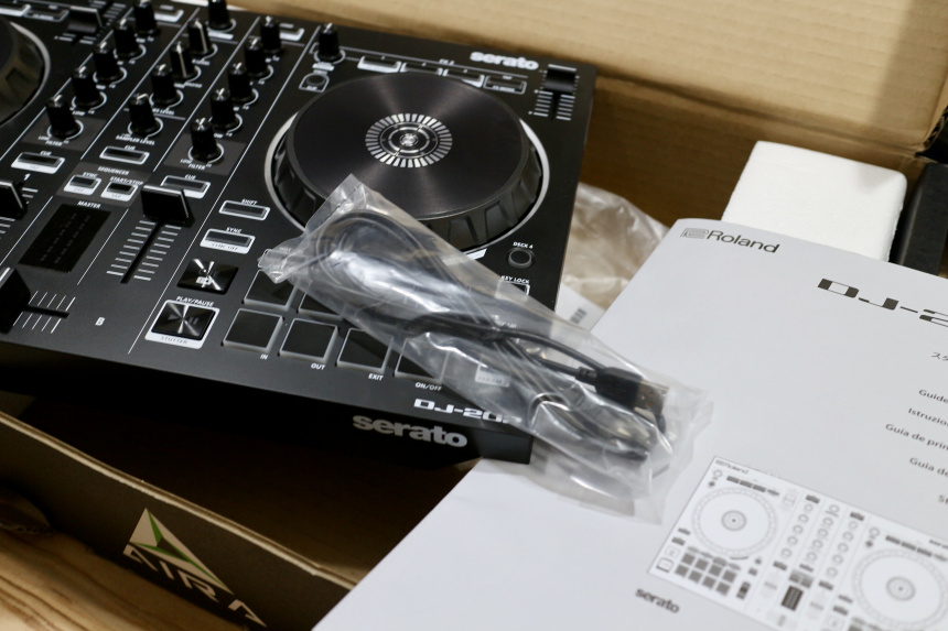[Índice]El DJ-202 viene en una caja de cartón grueso poco voluminosa que no guarda excesivas diferencias con las de los productos Roland Aira –decoración en negro, blanco y verde–. Viene acompañado de una versión “reducida” del manual de usuario, la versión completa del manual debes descargarla de internet, al igual que los drivers, que son necesarios y debes descargarlos –más sobre esto luego–, como también el software –Serato DJ Lite– y un sencillo cable USB negro.