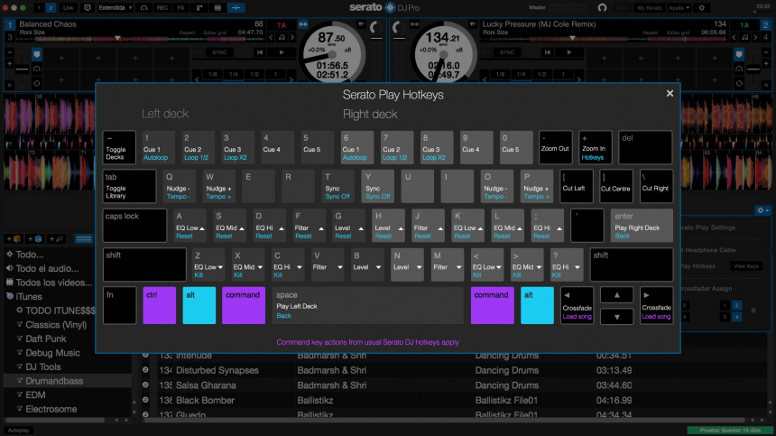 El problema está en que… no hay absolutamente nada más. Cuando usas Serato Play no puedes mapear un controlador MIDI de ningún tipo, la función de mapeo de hecho queda deshabitada por completo y todo debes hacer mediante teclado y ratón. Cierto es que Serato ha añadido nuevos hotkeys que se pueden activar desde un nuevo menú, y que sirven para controlar estas nuevas funciones –marean un poco porque al activarlo se cambia también la antigua distribución de hotkeys de Serato–, pero desde luego es bastante insuficiente.
