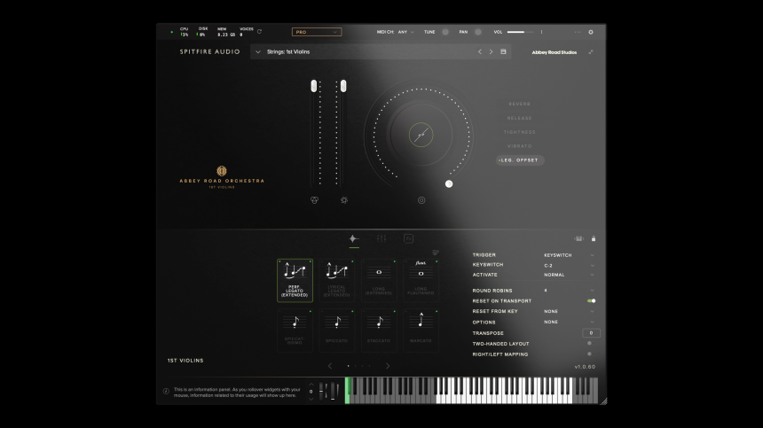 El estándar que sigue Spitfire en estas librerías es bastante apabullante: sección sinfónica de cuerdas, 9 tipos de legato, 5 capas dinámicas y 22 articulaciones para violines y celli. La orquesta funciona dentro de su propio plugin, el reproductor de Spitfire, por lo que no es necesario ningún otro software para cargarlo dentro de nuestro DAW.
