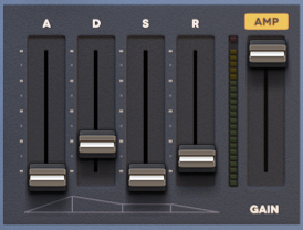 [Índice]Encontramos una envolvente simple de tipo ADSR para control del nivel. Está acompañada de un vúmetro y un control de volumen (GAIN), que permiten ver fácilmente cuándo el sonido empieza a saturar y corregir esa situación.