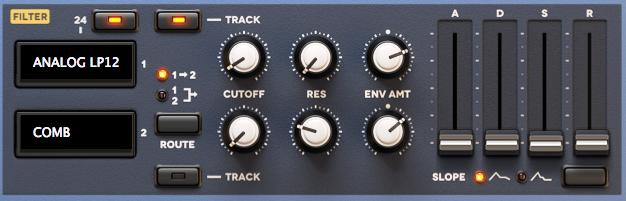 El filtro 1 cuenta con el pulsador rotulado 24, que permite obtener un filtrado de 24dB/oct, mucho más selectivo que el comportamiento de 12dB/oct, pero sólo para algunos tipos de filtro (LP, HP, BP). En sonidos como bajos es esencial pasar al modo de 24dB/oct, mientras en algunos pads podremos preferir el 'aire' adicional que ofrece un corte menos estricto.
