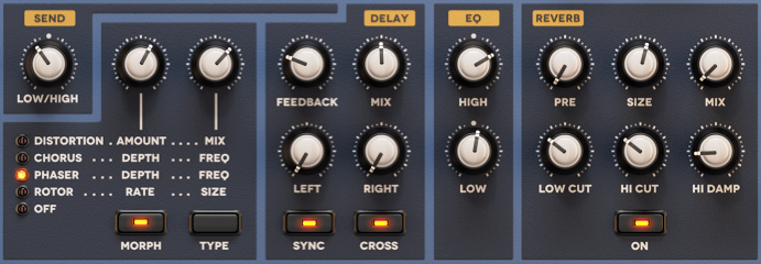 Quedan especialmente cortos en control el conjunto distortion/chorus/phaser/rotor. La EQ también muy simple con bajos y agudos nada más. El delay es el clásico para ecos, con tiempos diferentes para cada canal estéreo (sincronbizables al tempo del tema) y posibilidad de ping-pong (con el control CROSS).