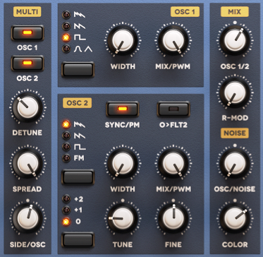 Todavía en la sección de los osciladores encontramos la columna de controles rotulada MULTI. Con ella podemos hacer que uno o ambos osciladores sea triplicado, manteniendo su afinación original y acompañándose de uno por encima y uno por debajo. SPREAD regula la apertura en semitonos, DETUNE permite una desafinación más delicada, y SIDE/OSC define la mezcla entre el sonido central y los desafinados.