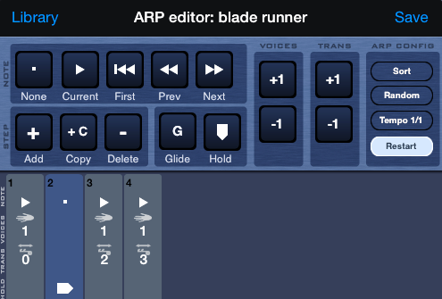 El número de pasos es ajustable (mediante add/copy/delete) y en cada paso puede elegirse cuál de las voces (1,2,3,...) del acorde que estemos tocando ha de usarse como base. En vez de una voz concreta, puede también especificarse el uso de la anteriormente elegida (current) o en movimiento hacia adelante / atrás (prev / next), o bien volver a recuperar la primera nota del acorder (first). La voz que corresponda a cada paso puede interpretarse tal cual o transpuesta un intervalo determinado. Se puede alargar el sonido de un paso para que ocupe varios (hold) y se puede reclamar el que la transición venga afectada de 'glide'.