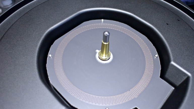 Respecto a la bandeja giratoria hay notables diferencias entre ambos modelos, entre otras cosas porque tienen diferentes motores. El 1200G emplea una bandeja de 3.6Kg fabricada en tres capas, con una de aluminio, otra interna de goma, y una capa superior de latón –bien visible por su aspecto dorado–, y se debe atornillar con tres grandes tornillos que acompañan el plato. La bandeja queda directamente atornillada sobre el doble rotor del motor “coreless” del dispositivo, es decir, a diferencia de los antiguos Technics, la bandeja del 1200G no incorpora el imán que queda montado sobre el stator para completar el motor, si no que todo el motor está en el cuerpo del plato –y con dos imanes, uno por encima y otro por debajo, y la bandeja se atornilla directamente sobre las piezas giratorias.