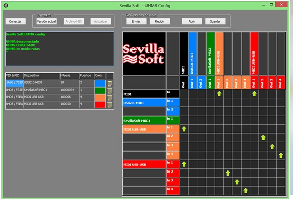 Los cambios se envían al hardware pulsando un botón ‘enviar’ y a la inversa, si queremos capturar el estado interno de UHMR podemos usar ‘recibir’ para observar las conexiones y rutas que tenga definidas. UHMR también permite descargar nuevas versiones de firmware al producto.