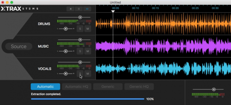 Con Xtrax Stems se generan tres pistas (voz, batería y el resto) de forma totalmente automatizada. Sin poder esperar la perfección en tan ardua tarea, no deja de ser bien útil. Una descomposición reversible: la mezcla de las tres pistas a los niveles de referencia devuelve la señal original. Pero el interés proviene de las posibilidades de realizar retoques en los balances de nivel y panorámica, así como producir finalmente tres ficheros estéreo en descomposición del original.