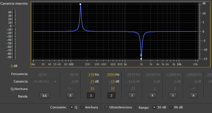 [Índice]Cuando estemos deseando localizar una frecuencia o banda estrecha, nada impide que elevemos el Q por ejemplo a un valor de 16 (aprox. un tono) o más, para realizar un barrido que nos ayude a situar en su sitio la frecuencia central. Pero una vez localizada la frecuencia a la que deseamos que actúe el EQ con la facilidad de ese Q alto, deberemos intentar ajustar el Q a la baja. Iremos regulando la ganancia y el Q para que la actuación sea lo menos invasiva posible, que no altere más allá de lo admisible el carácter de la señal. Hay que prestar oído a dos tipos de problema. Ya sea porque a través de la ganancia estemos exagerando las diferencias de nivel entre frecuencias tratadas y sin tratar, o porque a través del ajuste de Q estemos provocando una rotura detectable de la coherencia temporal de la señal.