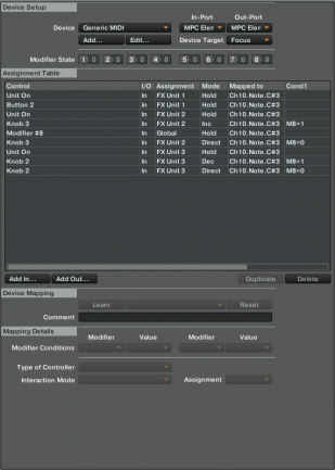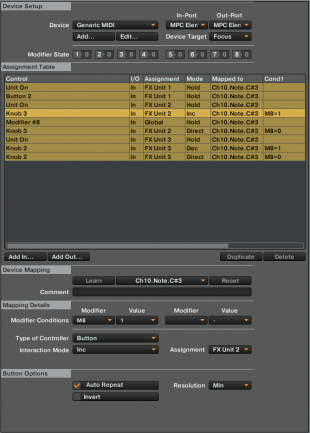 Sólo nos falta repetir lo mismo con el parámetro Color de Iceverb, pero esto ya es pan comido. Add In/FX Unit/Knob 2 , después Learn al botón, Assignment a FX Unit 3, opciones Button y esta vez en lugar de Inc elegimos Dec –vamos a hacer descender el valor del parámetro–, opción Auto Repeat con Resolution en Min. En Modifier Conditions elegimos M8 y Value 1, lo mismo que en el anterior parámetro automatizado. Ahora duplicamos la entrada para crear el “retorno” del parámetro a su posición original, como hemos hecho antes ponemos el valor de la condición del modificador en 0, opciones Button y Direct con Set to Value en 1.000.